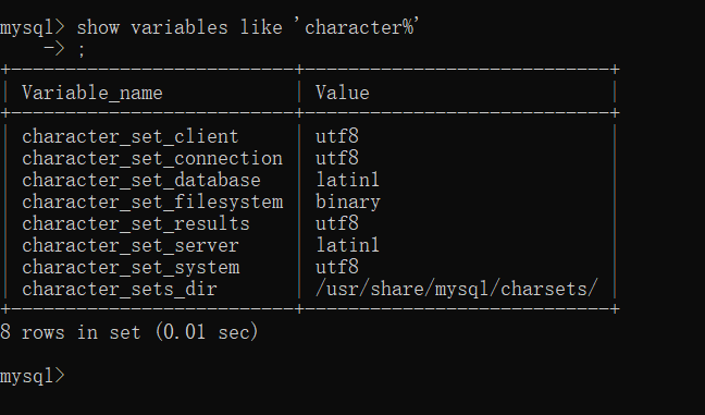 show variables like "char%";