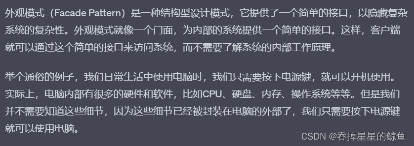 外观模式(Facade Pattern)是一种结构型设计模式,它为复杂的子系统提供一个更简单的接口。外观模式通过定义一个高层接口,隐藏了子系统的复杂性,使得使用者可以更加方便地访问子系统的功能。