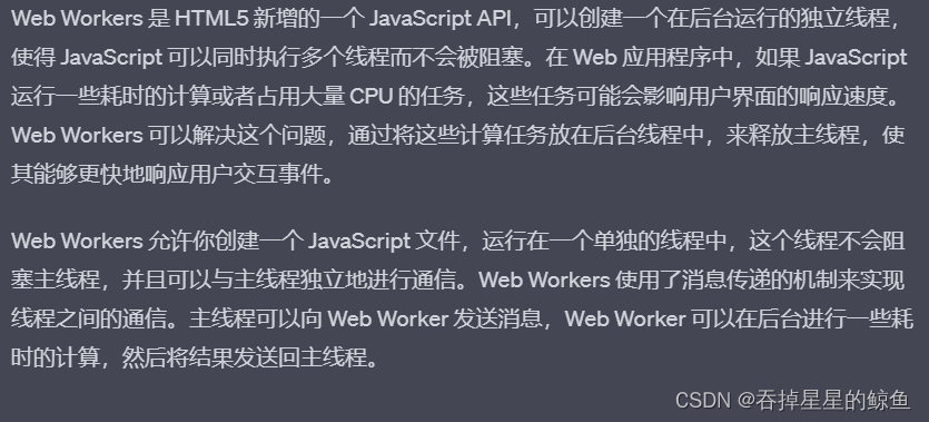 Web Workers:HTML5中的Web Workers可以在后台运行JavaScript代码,从而使得JavaScript不再阻塞网页的UI。