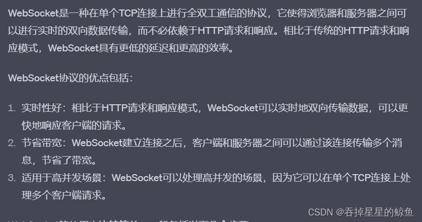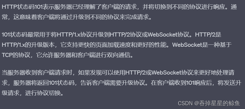 - 101 Switching Protocol:客户端发起升级协议请求,服务器同意切换协议。