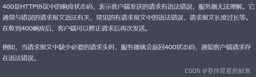 - 400 Bad Request:请求报文存在语法错误。