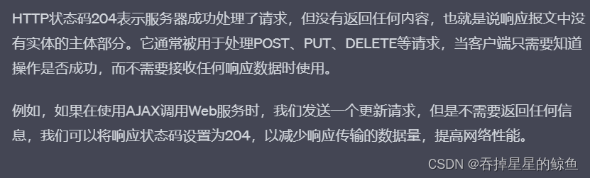 - 204 No Content:请求成功,但是响应报文不包含实体的主体部分。