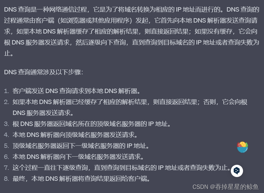 如果没有缓存,浏览器会尝试解析出对应的ip地址。这个过程被成为DNS解析,浏览器会首先检查自身的DNS缓存,如果缓存中没有对应的IP地址,浏览器会向本地DNS服务器发起DNS查询。