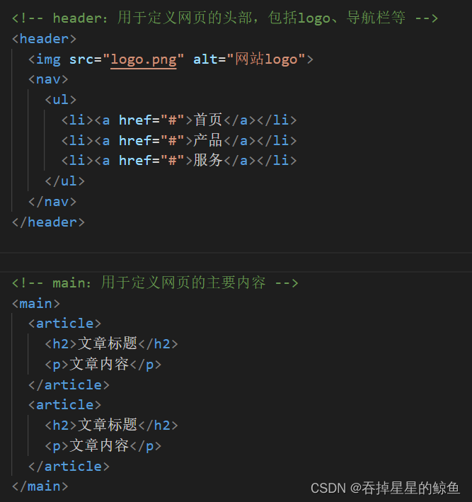 例如,在文章标题处使用<h1>标签而不是<div>或<span>标签,因为<h1>标签具有语义化,可以表明文章的主标题。而使用<div>或<span>标签则无法表达这个语义,也不利于搜索引擎抓取和理解网页的内容。