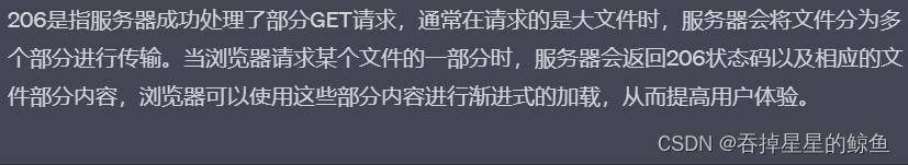 - 206 Partial Content:客户端进行了范围请求,服务器成功完成了请求。