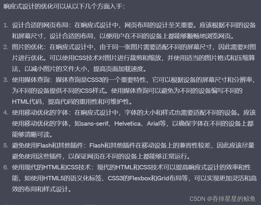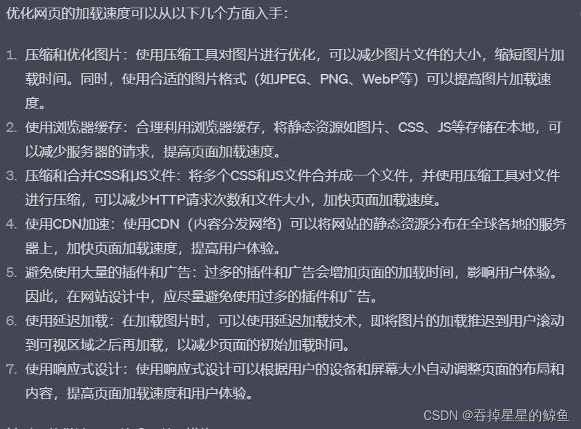 - 图片优化:使用图片格式、尺寸和压缩来减小图片文件的大小,避免过大的图片导致页面加载缓慢。