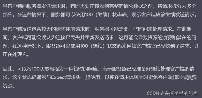 - 100 Continue:服务器已经收到请求头,并且客户端应该继续发送请求体。