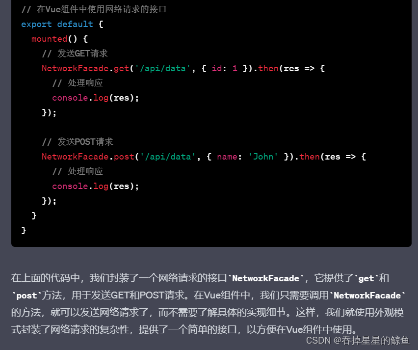 在这个例子中,我们创建了一个音乐播放器子系统,它包含了一些复杂的控制逻辑。然后我们使用外观模式创建了一个更简单的接口,将这些复杂的控制逻辑封装起来。最后我们创建了一个Vue组件,使用这个简单的接口来控制音乐播放器子系统。这样,使用者就可以更加方便地控制音乐播放器,而不用关心子系统的复杂性。