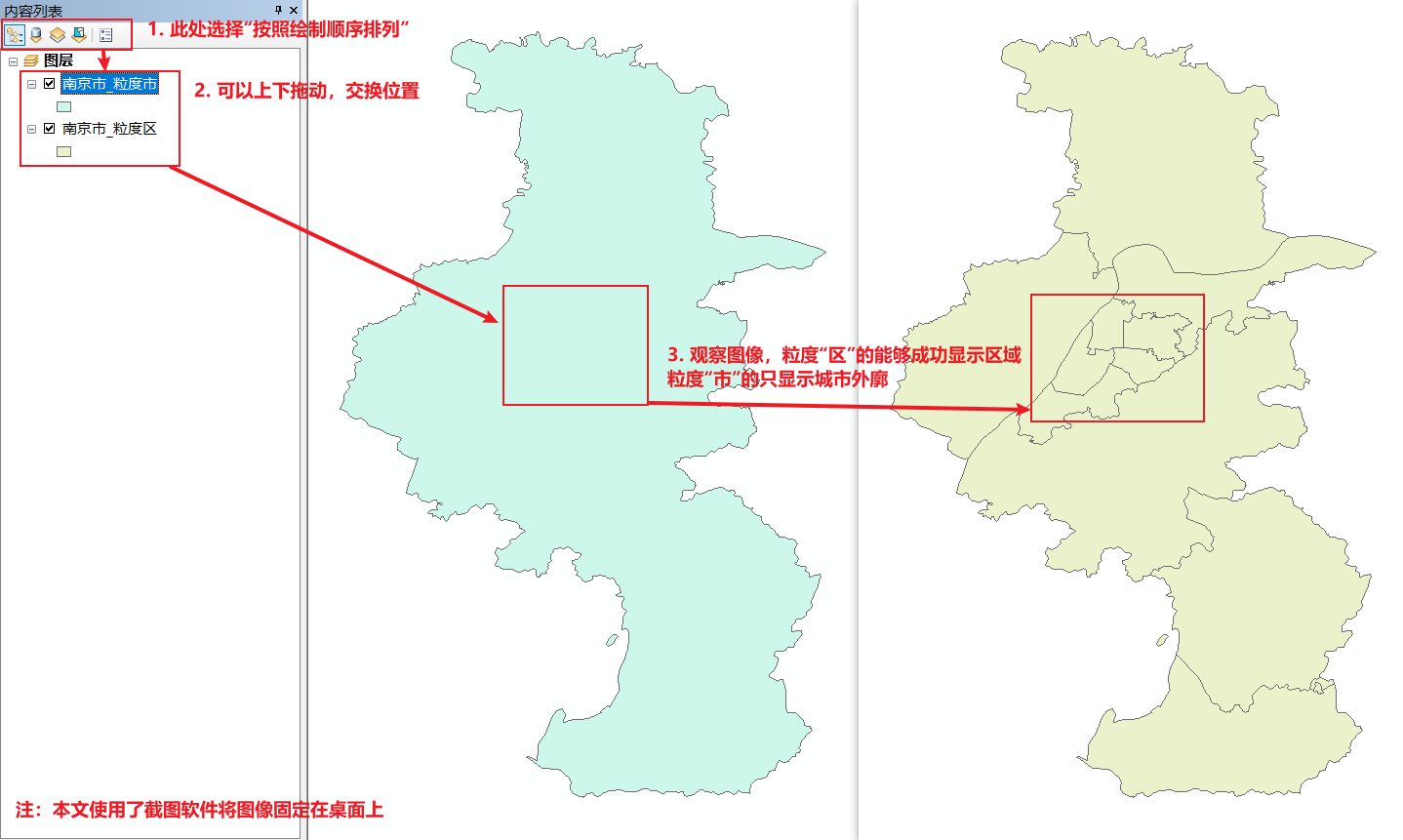 此处下载江苏省“下载区域”分别是“省、市、区”的geojson各一份,对比DataV.GeoAtlas可以看出,天地图下载的文件在名称上对“粒度(下载区域)”进行了区分。按照粒度不同,将“我国整体”三种粒度条件下的json文件下载下来,带有(2)的粒度为市、带有(1)的粒度为省。(3)下载的“南京市_粒度市.zip”和“南京市_粒度区.zip”进行解压缩,本文使用的解压软件为WinRAR,解压完成后内容如下所示,其中“南京市_粒度市.shp”和“南京市_粒度区.shp”即本文目标获取的文件。