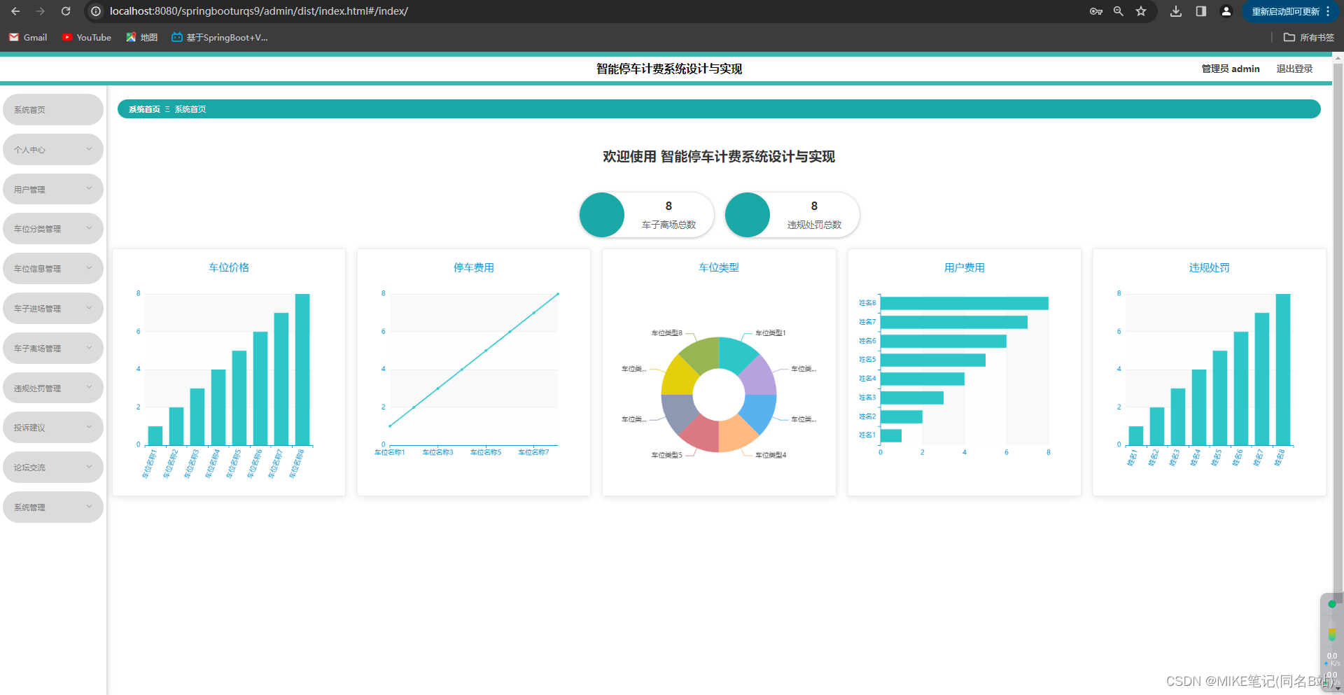 基于Spring Boot+Vue+MySQL的智能停车场计费系统设计与实现【有源码】 该系统采用了`java`技术、`SpringBoot `框架,连接`MySQL`数据库,具有较高的信息传输速率与较强的数据处理能力。包含管理员和用户两个层级的用户角色,系统管理员可以对系统`首页`,`个人中心`,`用户管理`,`车位分类管理`,`车位信息管理`,`车子进场管理`,`车子离场管理`,`违规处罚管理`,`投诉建议`,`交流论坛`,`系统管理`等功能进行详情,修改和删除操作;真正实现了管理工作的无纸化,并且还拥有角色及用户的添加与删除功能,可以很好的供所有用户使用。在对系统进行测试之后,确定可以实