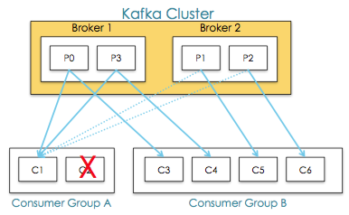rebalance表示"重平衡",consumer group内某个消费者挂掉后,其他消费者自动重新分配订阅主题分区的过程,是 Kafka 消费者端实现高可用的重要手段。如下图Consumer Group A中的C2挂掉,C1会接收P1和P2,以达到重新平衡。同样的,当有新消费者加入consumer group,也会触发重平衡操作。