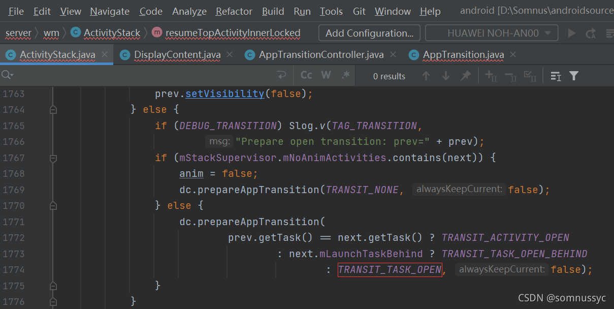 activityPaused阶段的resumeTop设置动效类型为TRANSIT_TASK_OPEN,针对startActivity场景其实该处设置无效,因为之前startActivity流程已经设置过,但是对于back键等途径触发的resumeTop场景的设置仍然有效。