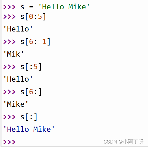 具体语法格式为:【头下标:尾下标】 ,这种访问方式称之为“切片”。但注意这是左闭右开的区间。在切片方式中,若头下标缺省,表示从字符串的开始取子串;若尾下标缺省,表示取到字符串的最后一个字符;若头下标和尾下标都缺省,则取整个字符串。