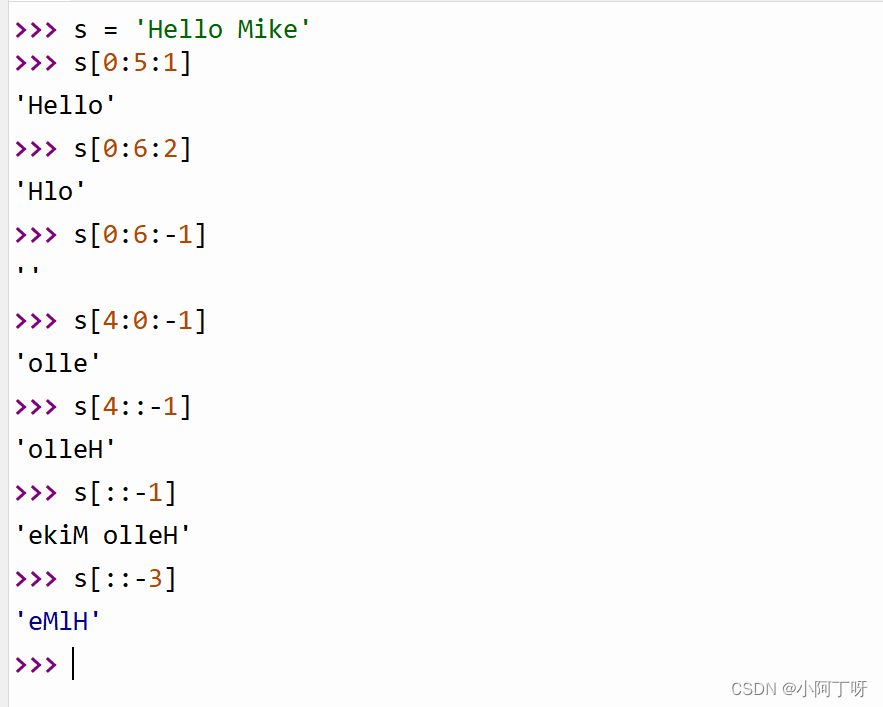 字符串切片还可以设置取子字符串的顺序,格式为【头下标:尾下标:步长】。当步长大于0的时候,从左往右取字符;当步长小于0的时候,从右往左取字符。