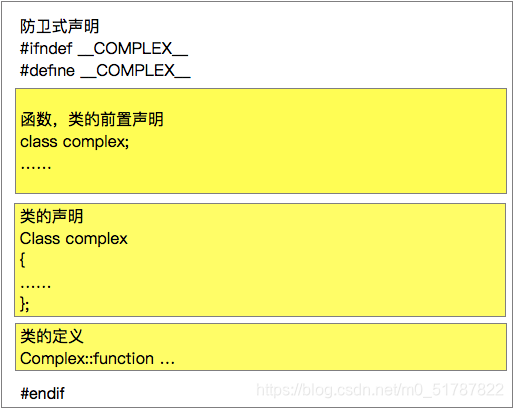 以下代码若complex.h中,无防卫式声明,下面的代码会报出"./complex.h:7:7: error: redefinition of 'complex'"(重复定义)错误。这是因为,在编译器预编译的阶段,会将.h文件展开成其中的内容,无防卫式声明则会重复定义,造成上面的问题。