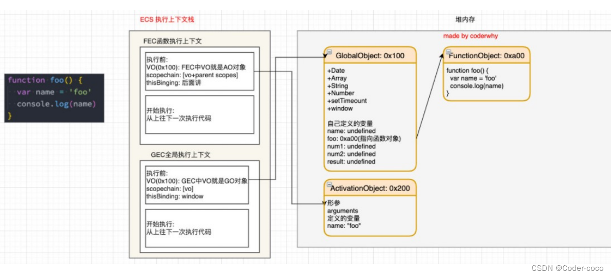 - 在执行的过程中执行到一个函数时,就会根据函数体创建一个函数执行上下文(Functional Execution Context,简称FEC),并且压入到EC Stack中。