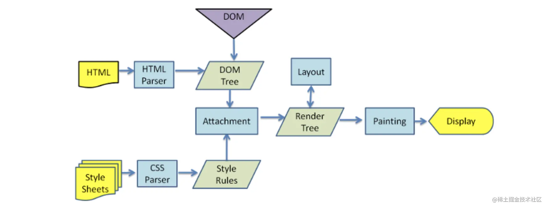 浏览器会先下载HTML形成DOM树,在中途如果遇见CSS标签就开始下载CSS并解析,结合DOM树和CSS文件生成渲染树,浏览器根据渲染树,将页面绘制在屏幕上。如果在中途碰到JavaScript代码,会停止解析HTML和CSS,去执行JavaScript代码。