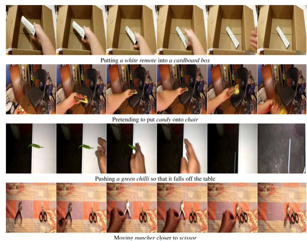 something-something视频数据集简介 文献:The something something video database for learning and evaluating visual common sense.本数据集为大规模众包生成,即视频由众多不同的人贡献,包括1133个众包工作者。包含108499个视频,横跨174个标签,每个视频2-6秒。按8:1:1的比例划分训练集、测试集、验证集。数据集的划分按照同一上传者的视频在一个集合内。数据集为人与物的交互,从其标签上也可以看出“把某物放入某物”。我理解的更准确的应该是“