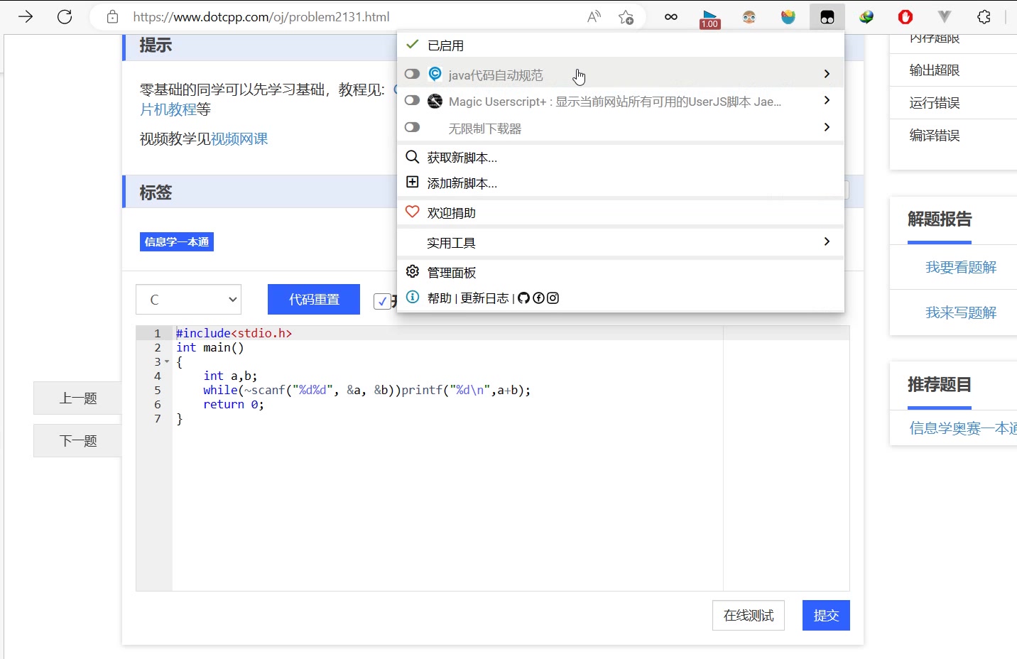 编写油猴脚本自动将java代码修改为符合算法网站提交的格式 最近在准备Java蓝桥杯比赛,在洛谷、C语言网、gxuOJ刷算法题时总是需要在提交代码前将Java代码的package xxxx删去,同时将主类名改为Main,同时C语言网和Oj还要自己选择语言,于是打算编写一个油猴脚本将这些事情自动完成。自动选择编程语言为Java自动将java程序的导包去掉、主类改为Main。