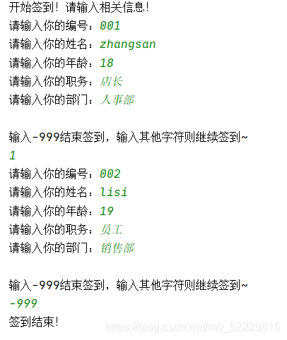 System.out.println("输入-999结束签到,输入其他字符则继续签到~");