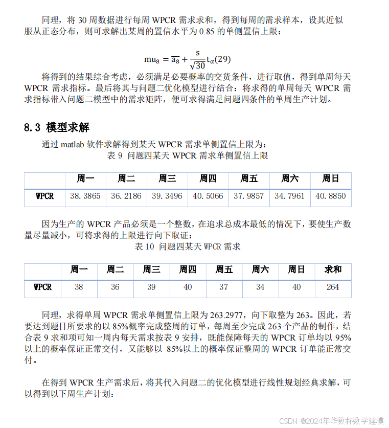 的 WPCR 需求小于此上限的概率为 85%,据此制定了新的周生产计划,该计划下最小