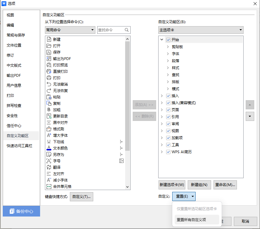 选择自定义功能区->重置->重置所有自定义项