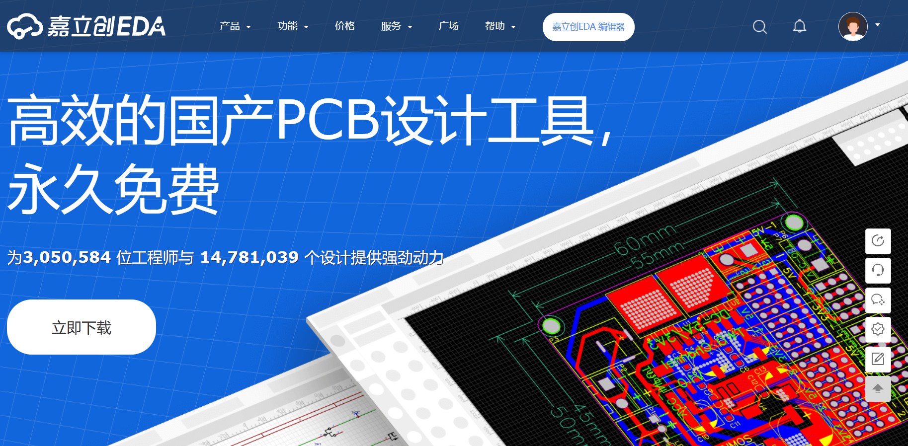 Pcb课程设计——国产立创EDA 国产EDA设计工具,软件支持电路仿真、原理图与PCB设计、面板设计等众多强大的电路设计功能,满足用户的多元化需求。集成超百万的免费封装库、上万种3D模型库以及海量开源工程。