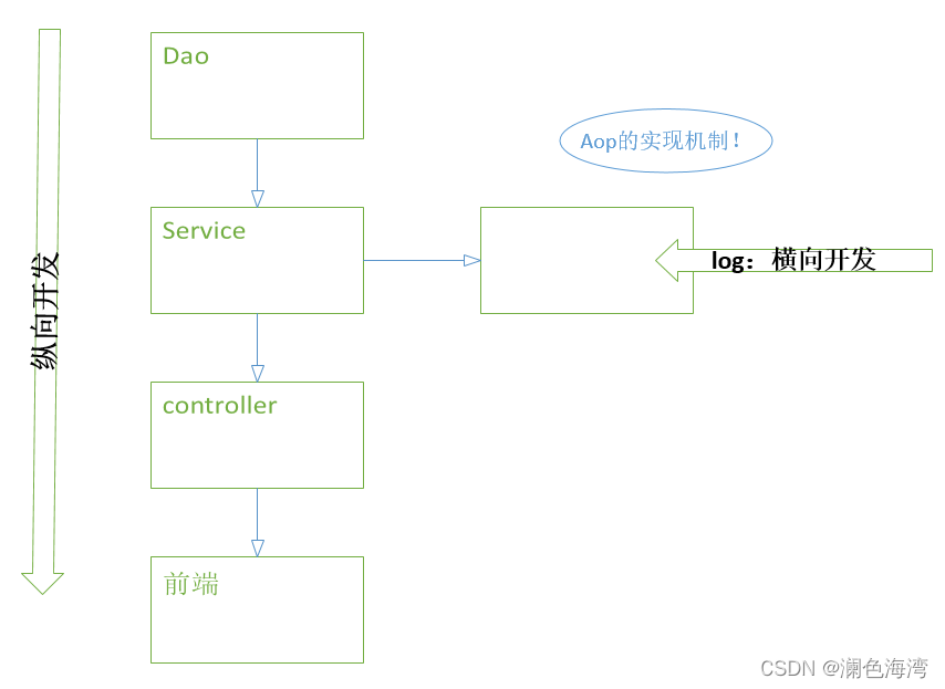 我们日常的开发都是如图中的纵向开发流程和框架一样,但是当我们将产品投入使用之后,用户突然又给我们提出了一个要求,需要对产品的功能进行该井或者添加,这时候我们不应该去改动原有的代码(改动原有代码是公司中的大忌!),所以这时候我们可以创建一个代理类,将新需求如图中横向开发(也就是我们常说的AOP机制!)进行开发添加。