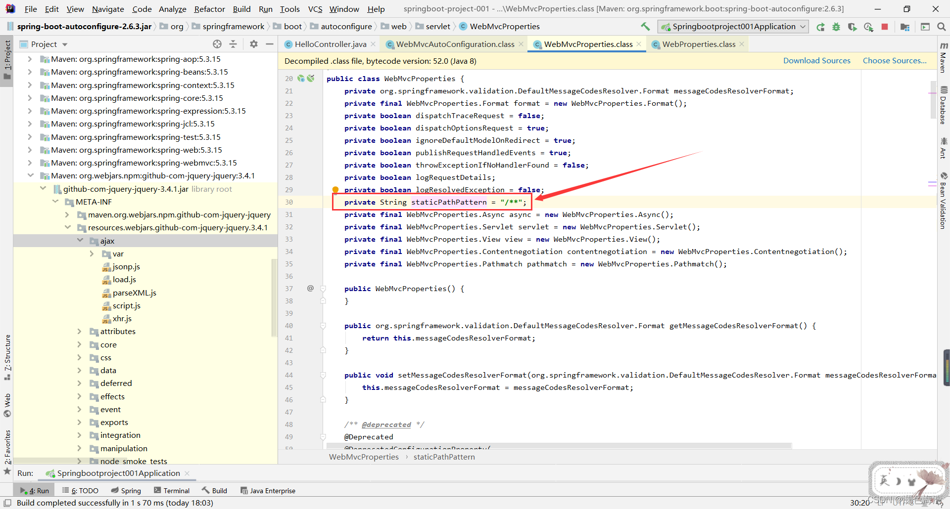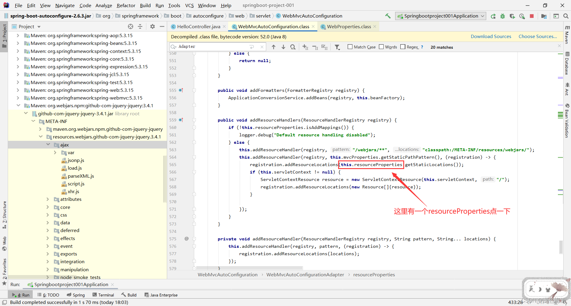 classpath:/META-INF/resources/webjars这个目录下寻找,而这个目录的结构只要是在webjars官网上拷贝的依赖添加进来都会符合这个结构。也就是说在不修改默认属性的情况下一定是能找得到到的,如下图所示: