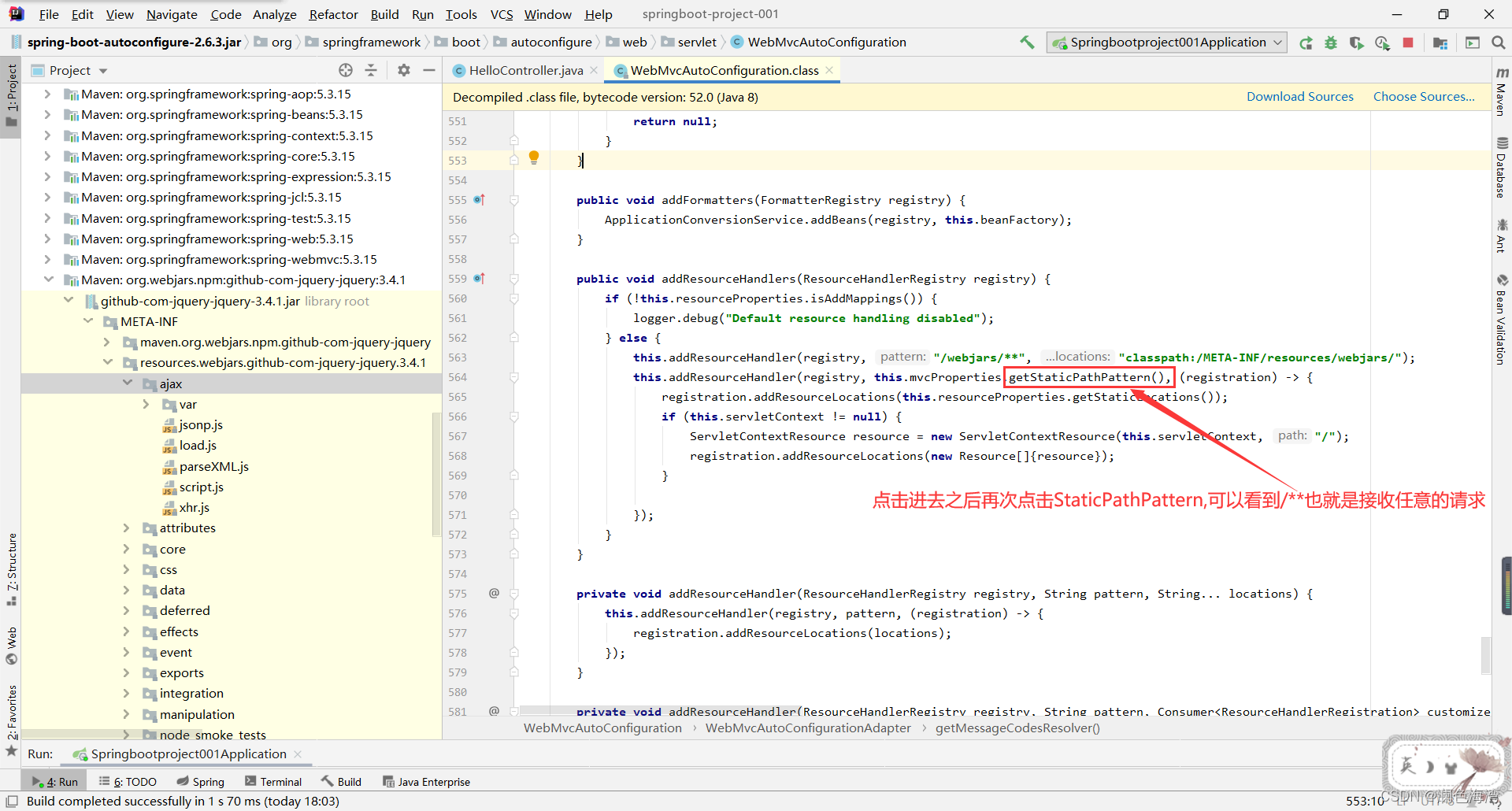 如果我们没有自定义修改属性,那么就会进入下一个添加静态资源的方法:该方法是去webjars下面找,只要是在webjars/下请求的静态资源,都会去