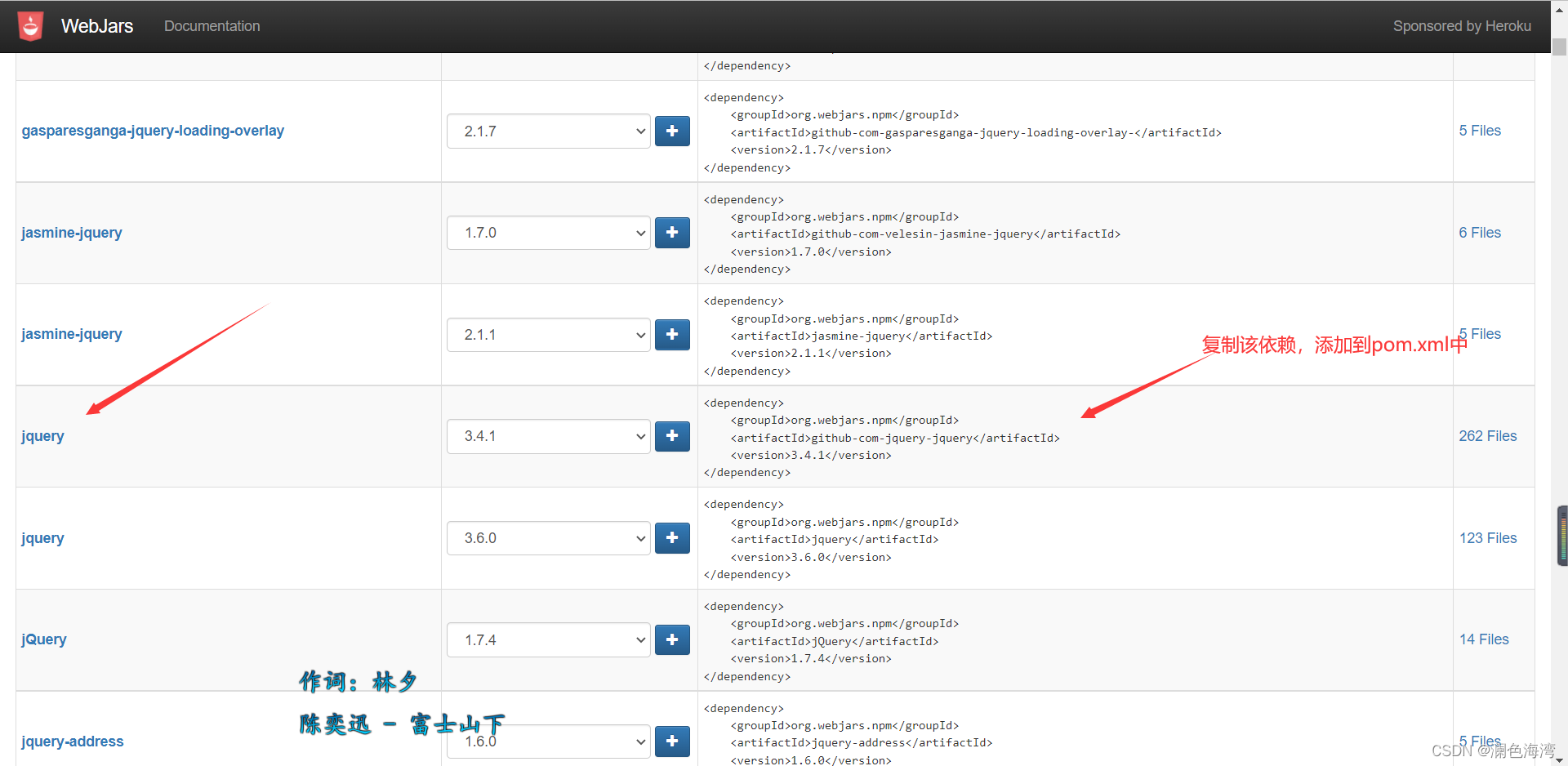 那我们进入webjars官网:https://www.webjars.org/,在里面可以直接拷贝到js相关的maven依赖,然后拷贝依赖放到自己项目的pom.xml文件中即可。