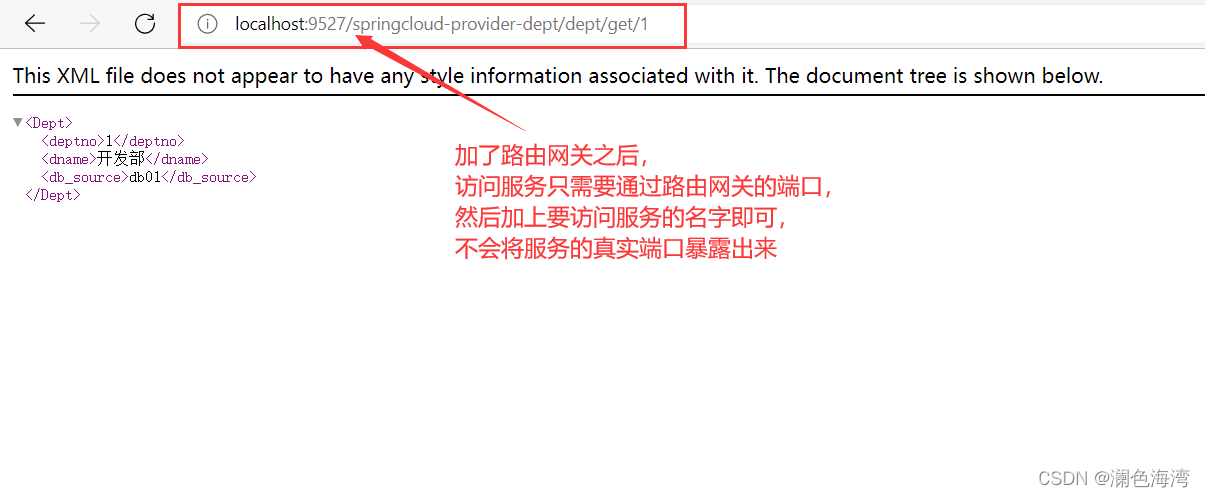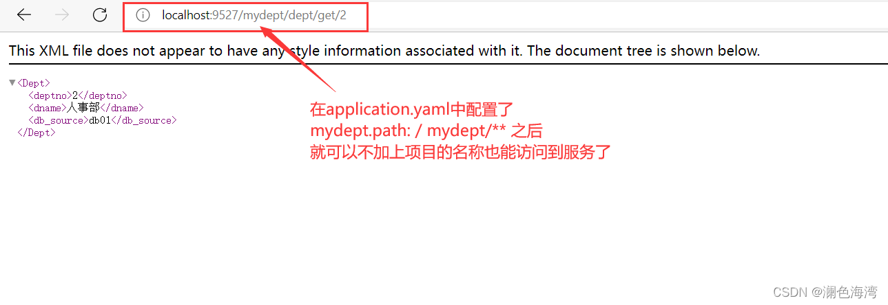 在application.yaml中配置了 mydept.path: /mydept/** 之后,就可以通过路由端口9527且不加上项目的名称,也能访问服务了。
