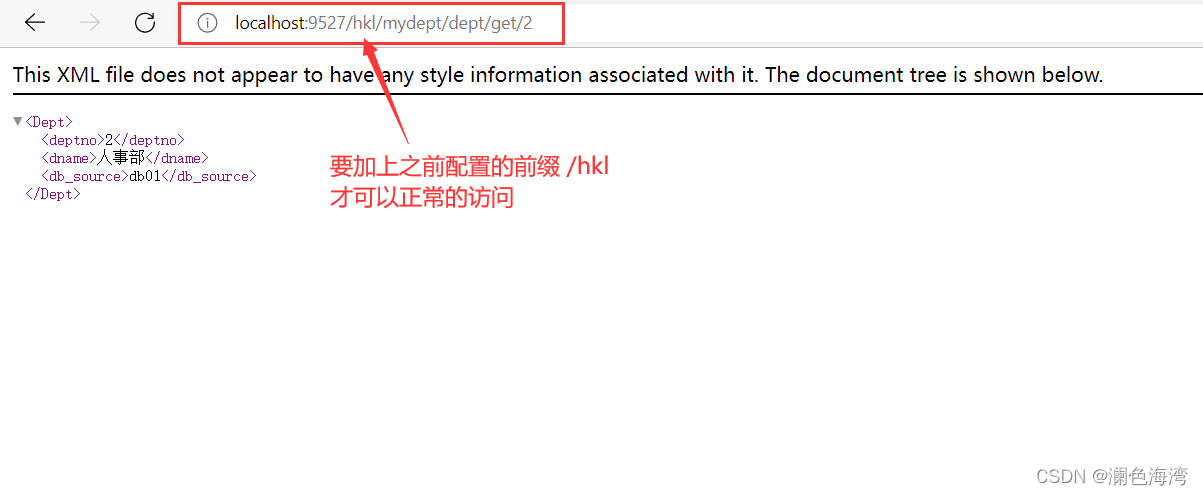 加了前缀之后要访问服务就得在mydept前再加上hkl才可以成功访问