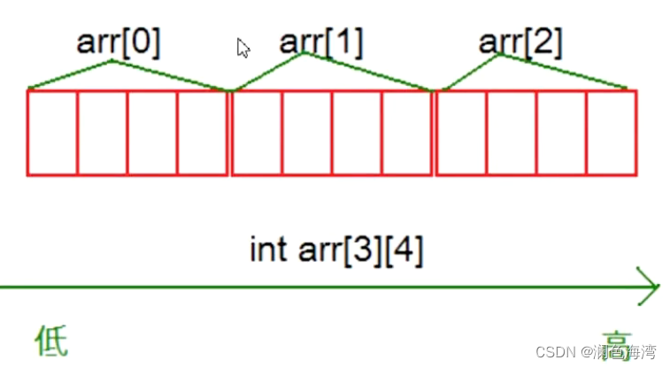 虽然说他是一个三行四列的二维数组,但是在空间内存上来说 他还是一个连续存储的一维数组
