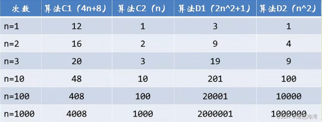 我们观察发现,哪怕去掉与 n 相乘的常数,两者的结果还是没有改变,算法 C2 的次数随着 n 的增长,还是远小于算法 D2