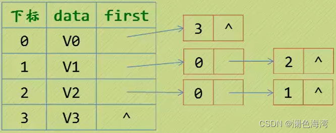 若是有向图,邻接表结构也是类似的,我们先来看下把顶点当弧尾建立的邻接表,这样很容易就可以得到每个顶点的出度: