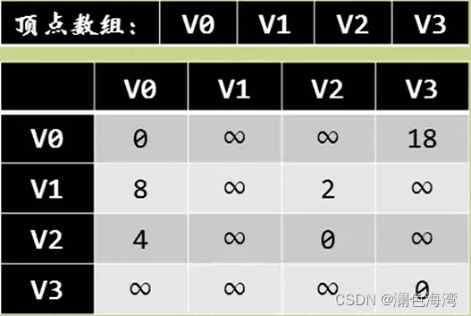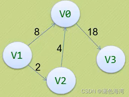 可见顶点数组 vertex [ 4 ] = {V0,V1,V2,V3},弧数组arc [ 4 ] [ 4 ] 也是一个矩阵,但因为是有向图,所以这个矩阵并不对称,例如由 V1 到 V0 有弧,得到 arc [ 1 ] [ 0 ] = 1,而 V0 到 V1 没有弧,因此arc [ 0 ] [ 1 ] = 0;