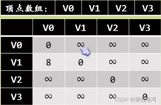 我们可以设置两个数组,顶点数组为vertex[4] = { v0,v1,v2,v3 } ,边数组 arc [ 4 ] [ 4 ] 为对称矩阵(0表示不存在顶点间的边,1表示顶点间存在边);