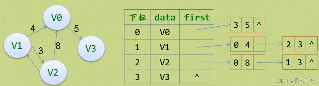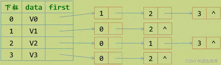 因此我们可以考虑另外一种存储结构方式,例如把数组与链表结合一起来存储,这种方式在图结构也适用,我们称为邻接表(AdjacencyList);