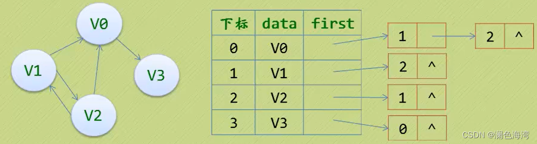 - 图中每个顶点 Vi 的所有邻接点构成一个线性表,由于邻接点的个数不确定,所以我们选择用单链表来存储;