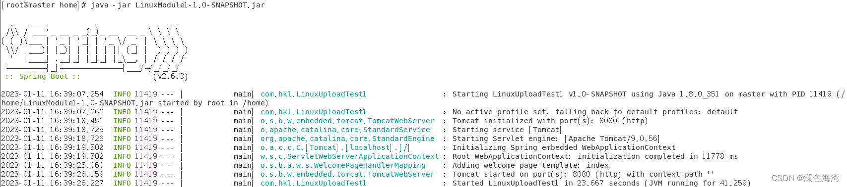 然后将打包好的 springboot项目 用 Xshell 和 Xftp 上传到 Linux 中去,最后在 Linux 终端,进入到上传项目的文件夹用以下命令启动项目 ->