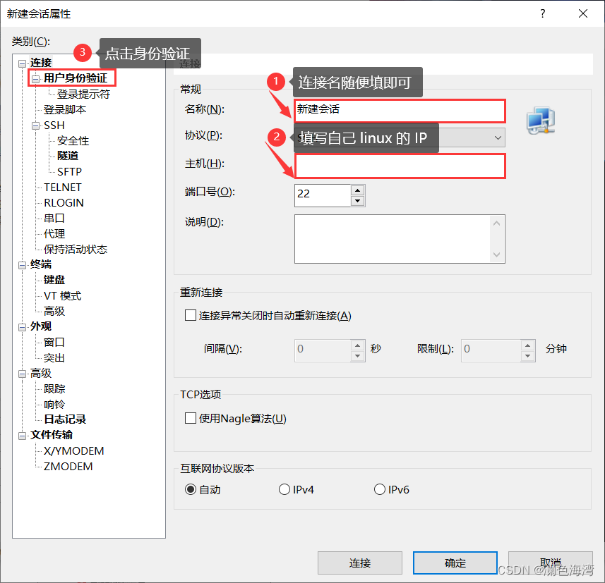 2.输入 连接名、IP,点击身份验证 ->