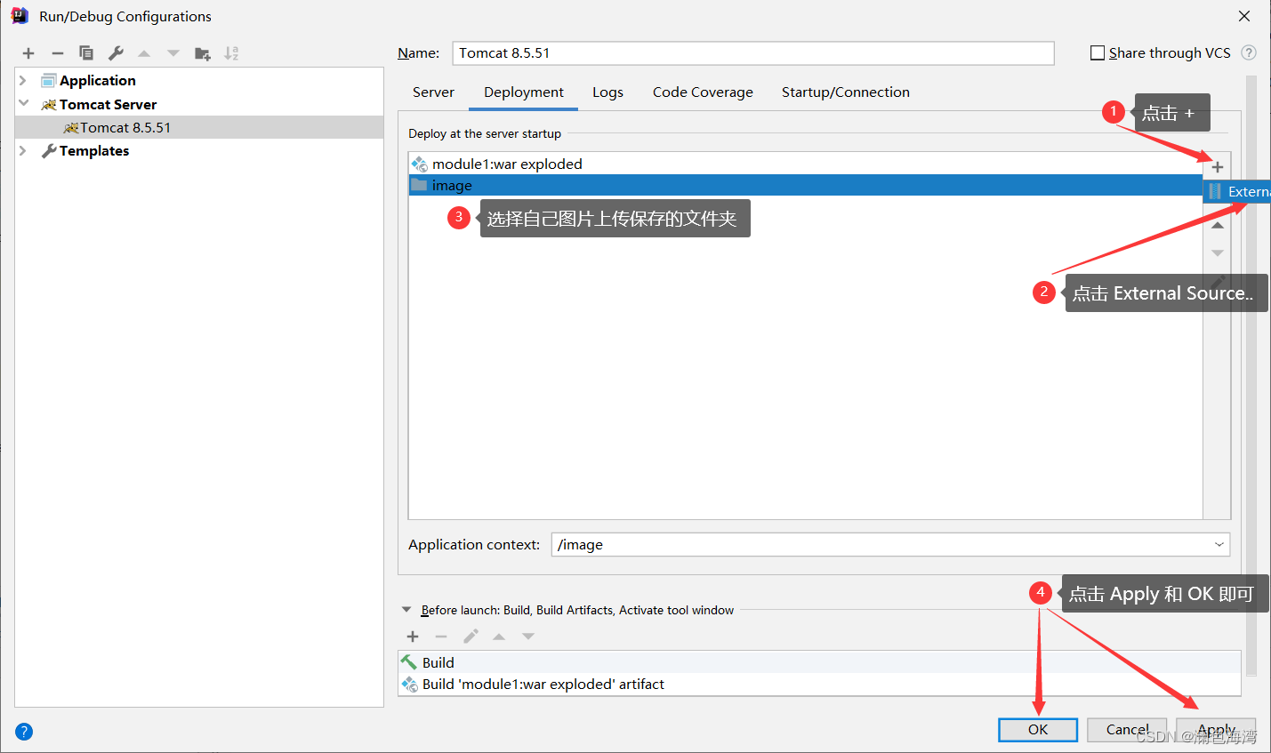 第一步:打开 IDEA 中 Edit Configurations... -> Deployment -> + -> External Source.. -> 选择自己图片上传保存的文件夹、点击OK -> 最后 Appliy -> OK 即可