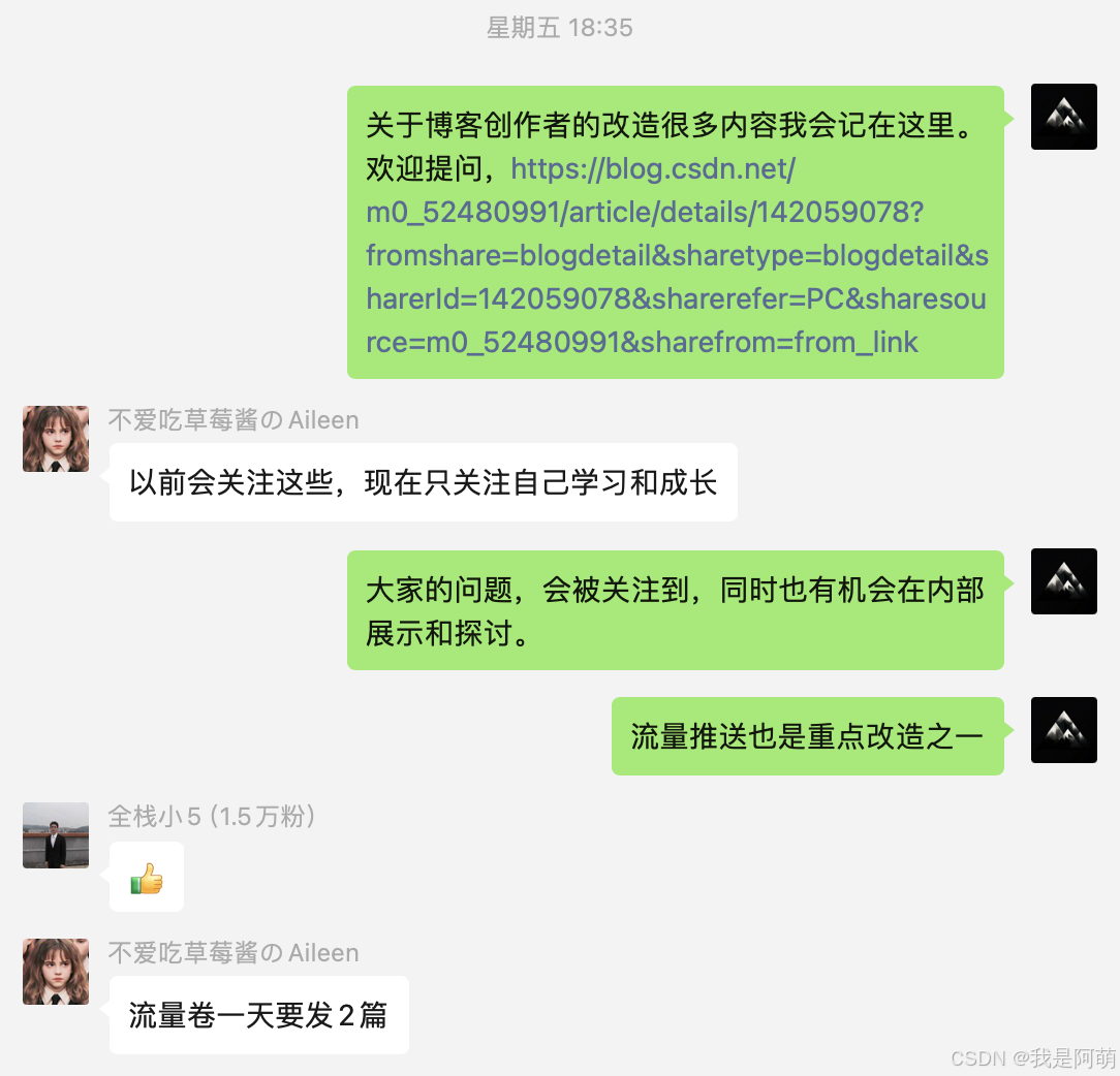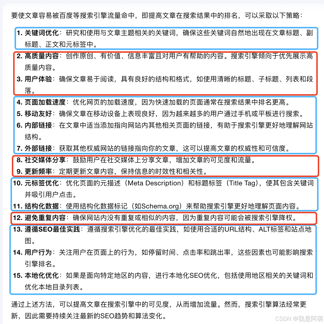 上图中,蓝色部分主要依靠 CSDN 网站能力,目前做的还不错,大家可以忽略。红色部分是大家可以掌控的。重点可以概括为:原创、高质量、良好的结构/排版、高频更新、主动分享。
