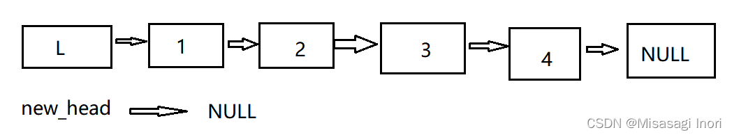当旧头结点指向空的时候,说明链表逆转结束,此时将原本链表的头结点L跟新的链表的头结点相连,即 L->Next = New_head;