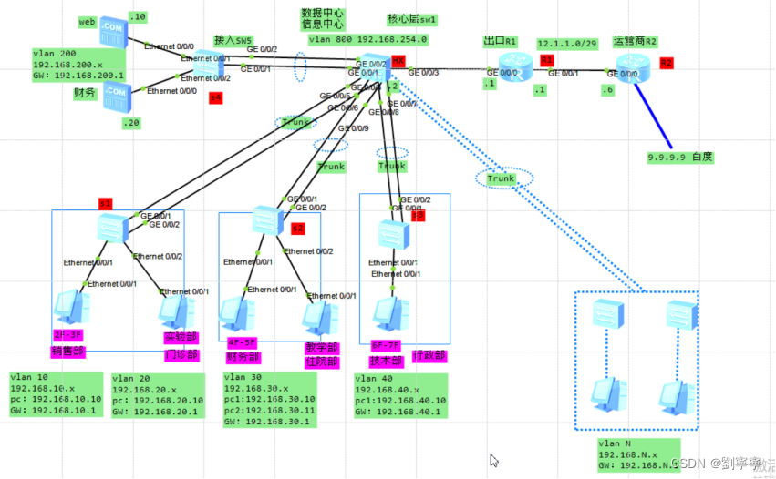 ensp实验 链路聚合 链路聚合,NAT配置实验要求:1.设置合理的STP优先级、边缘端口、Eth-trunk2.企业内网划分多个vlan ,减少广播域大小,提高网络稳定性3.所有设备,在任何位置都可以telnet远程管理 4.出口配置NAT5.所有用户均为自动获取ip地址6.在企业出口将内网服务器的80端口映射出去,允许外网用户访问7.企业财务服务器,只允许财务部(vlan 30)的员工访问.............