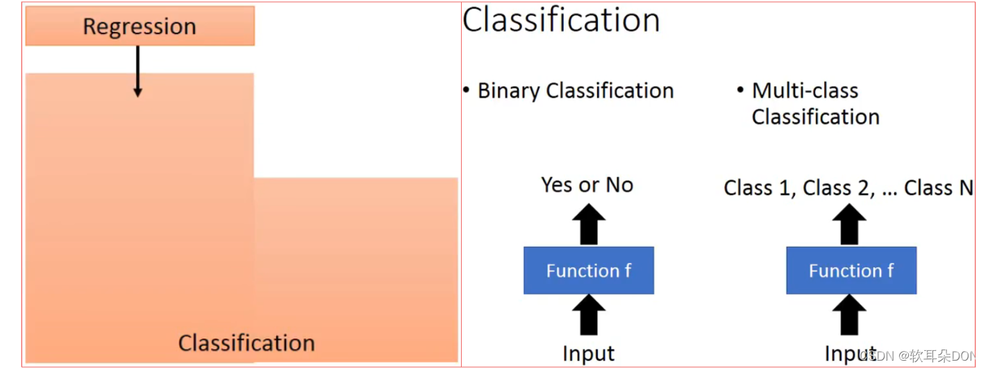 剛才講的是 Regression ,接下來要講的是Classification分类的问题。那 Regression 和Classification的差別是,我們要機器輸出的東西的類型是不一樣的。在 Regression 裡面機器輸出的是一個數值。Classification問題又分成兩種,一種叫做Binary Classification,二元的分類。在二元的分類裡面,我們要機器輸出的就是是或否,Yes或No。那另外一類Classification的Problem叫Multi-Class的Classification。在Multi-Class的Classification裡面,機器要做的事情是要做一個選擇題。你等於是給它數個選項,每一個選項就是一個類別,它要從數個類別裡面選擇正確的類別,這叫Multi-Class的Classification。