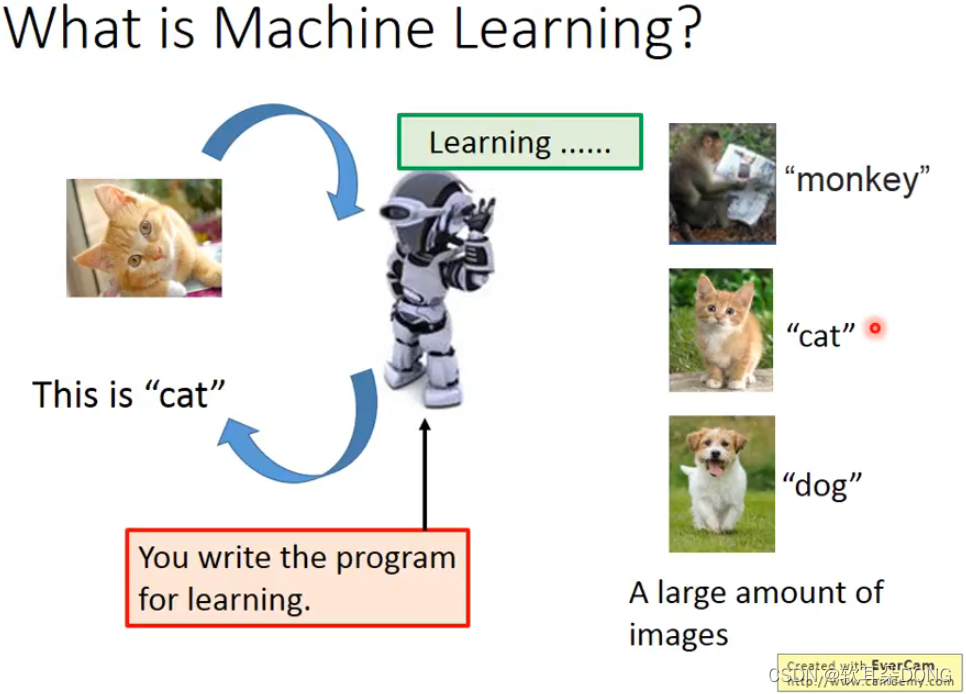 我們要做的其實是,讓機器它有自己學習的能力,也就是我們要做的應該是 Machine Learning 的方向。如果講得比較擬人化一點,所謂 Machine Learning 的方向就是你就寫一個程式,然後它讓機器變得很聰明,它就能夠有學習的能力,接下來就像教一個嬰兒或小孩一樣,你並不是寫程式讓它做到這件事,你是寫程式讓它具有學習的能力。接下來你就可以用像教小孩一樣的方式告訴它說,假設你要它學會做語音辨識,你就告訴它,這段聲音就是 “Hi”,這段聲音就是 “How Are You”,這段聲音就是 “Good Bye”。然後希望接下來它就學會了,然後你給它一段新的聲音,它就可以幫你產生語音辨識的結果。或者是如過你希望它學會怎麼做影像辨識的話,你可能不太需要改太多的程式,因為它本身就有學習的能力。你只是需要教它告訴它說,看到這張圖片,你要說這是猴子,看到這張圖片,你要說這是貓,看到這張圖片,你要說這是狗,它就具有影像辨識的能力了。接下來看到它沒有看過的貓,希望它可以認得。