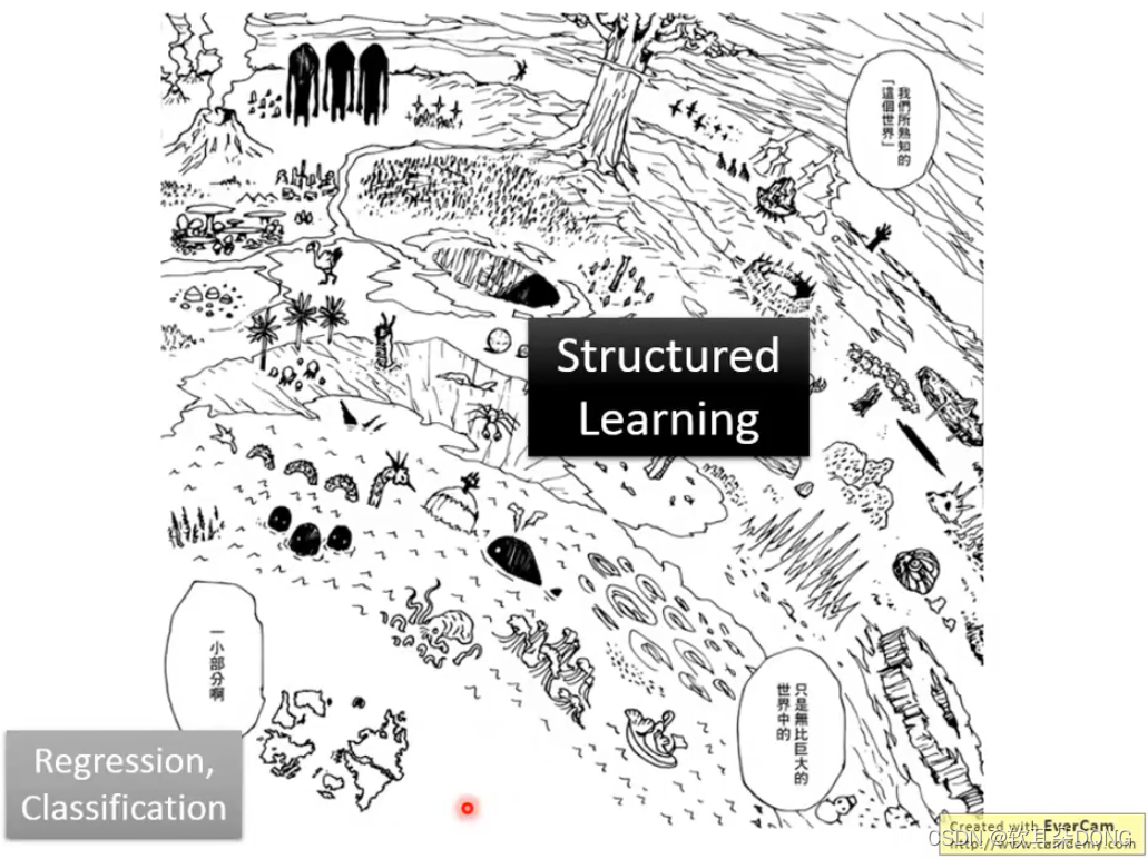 我知道多數人可能都聽過 Regression ,也聽過Classification,你可能不見得有聽過 Structured Learning 。這時候教授就會直接寫說Machine Learning就是兩大類的問題:Regression的Problem,還有Classification的Problem。但是說Machine Learning只有Regression和Classification的Problem,就好像是告訴你說,這個是我們熟知的世界,它有五大洲。事實上這個只是真實的世界一個小部分而已,真正的世界其實是這個樣子的,這個是暗黑大陸,可是我們這輩子永遠也到不了的。Structured Learning就像是暗黑大陸一樣,這裏面還有很多很多問題是人類還沒有探究的。事實上最近有一個很潮的技術叫做Gan,這個技術其實就是一個新的Structured Learning的方法,這個我們之後也會提到。