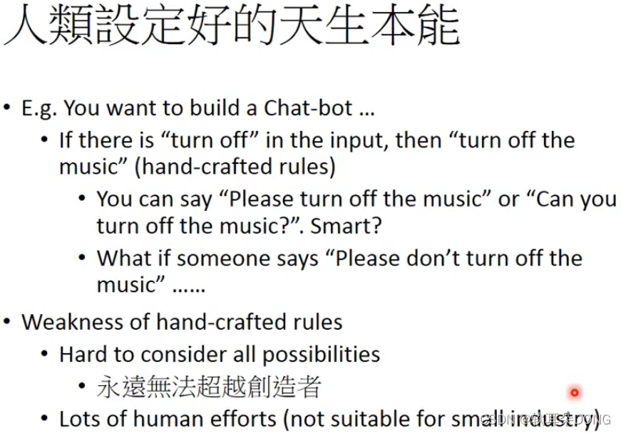 那機器的本能跟生物的本能其實很像。假設有一天,你想要做一個 Chat-Bot。如果你不是用 Learning 的方式,也不是用機器學習的方式,而是給它天生的本能的話,那像是甚麼樣子呢?你可能會在這個 Chat-Bot 裡面,在這個聊天機器人裡面,設定一些規則,這些規則我們通常稱之為 Hand-Crafted Rules,就是人設定的規則。假設你今天要設定一個對話機器人,它可以幫你打開和關掉音樂的話,那你的做法可能是這樣:“設定一條規則,就是寫程式這樣,如果輸入的句子裡面,看到 Turn Off 這個詞彙,那麼 Chat-Bot 要做的事情就是把音樂關掉”。這個時候,你之後對 Chat-Bot 說。"Please Turn Off The Music.” 或 “Can You Turn Off The Music, Please?”,它就会帮你把音樂關掉。看起來好像很聰明,人家就會覺得,嗯!果然這就是人工智慧。但是如果你今天想要欺負那個 Chat-Bot 的話,你就可以說:"Please Don't Turn Off The Music.”,但是它還是會把音樂關掉。這是個真實的例子,你可以看看你身邊有沒有類似的 Chat-Bot。然後你去真的對它說這種故意欺負它的這種話,它其實是會答錯的。這其實是真實的例子,不要告訴你是哪家公司的產品,這家公司也是號稱他們做了很多 Ai 的東西。不要讓你發現是哪一家的產品,免得被告。用這個 Hand-Crafted Rules 有甚麼壞處呢?它的壞處就是,Hand-Crafted Rules 沒有辦法考慮到所有的可能性,它非常的僵化,而用 Hand-Crafted Rules 創造出來的 Machine,它永遠沒有辦法超過它的創造者,也就是人類。人類想不到的東西,你就沒有辦法寫規則,你沒有寫規則,機器就不知道要怎麼辦。所以一個機器如果只能按照人設定好的 Hand-Crafted Rules,它所有的行為都是 Set 好,它都沒有 Free Style 的。如果是這樣子的話,它就沒有辦法超越創造它的人類。你可能會說,但是你好像看到很多 Chat-Bot,看起來非常的聰明。這些 Chat-Bot,如果是個非常大的 Industry,其實它可以 Hire 成千上萬的工程師這類的職業,以血汗的方式,來建出數以萬計的規則,然後讓它的機器看起來好像很聰明。但是對於中小企業來說,這樣建規則的方式,反而是不利的。所以我認為機器學習的發展,對於比較小規模的企業反而是有利的,因為接下來也不需要 Hire 非常大量的人來幫你想各式各樣的規則。你只要手上有 Data,你可以讓機器來幫你做這件事情。當然怎麼 Collect Data 又是另外一個問題,這個不是我們今天要討論的主題。